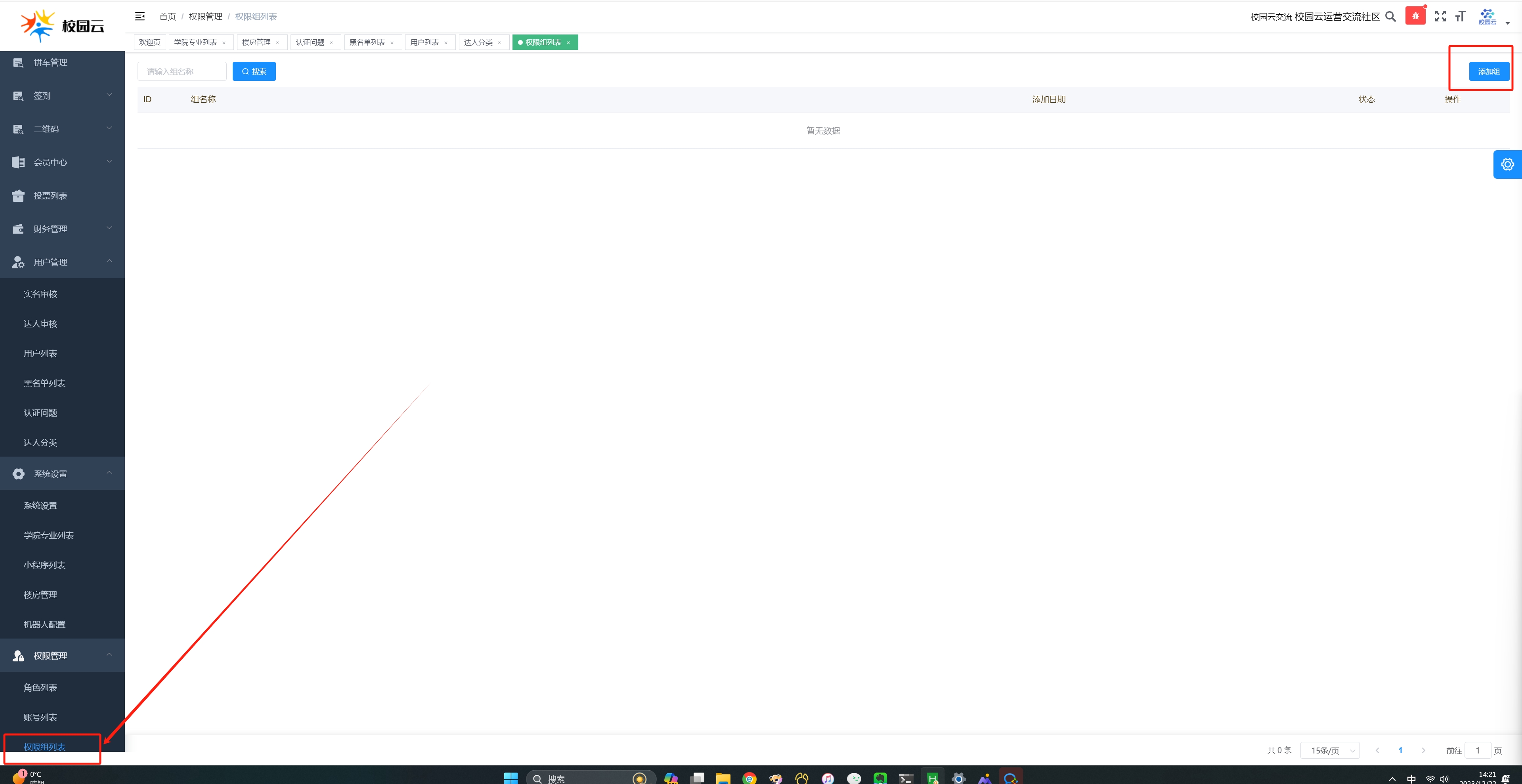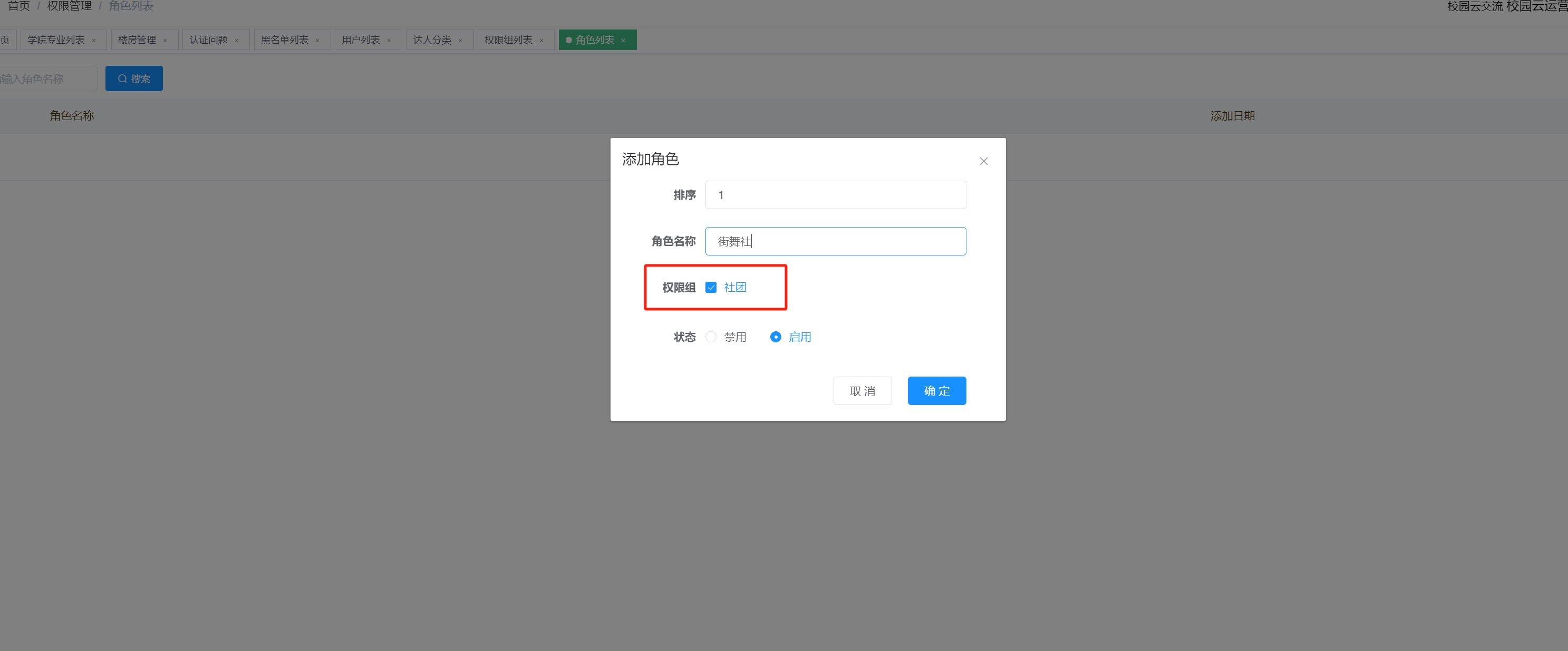 - 第一步先创建一个权限组,比如:社团的负责人:可以给他