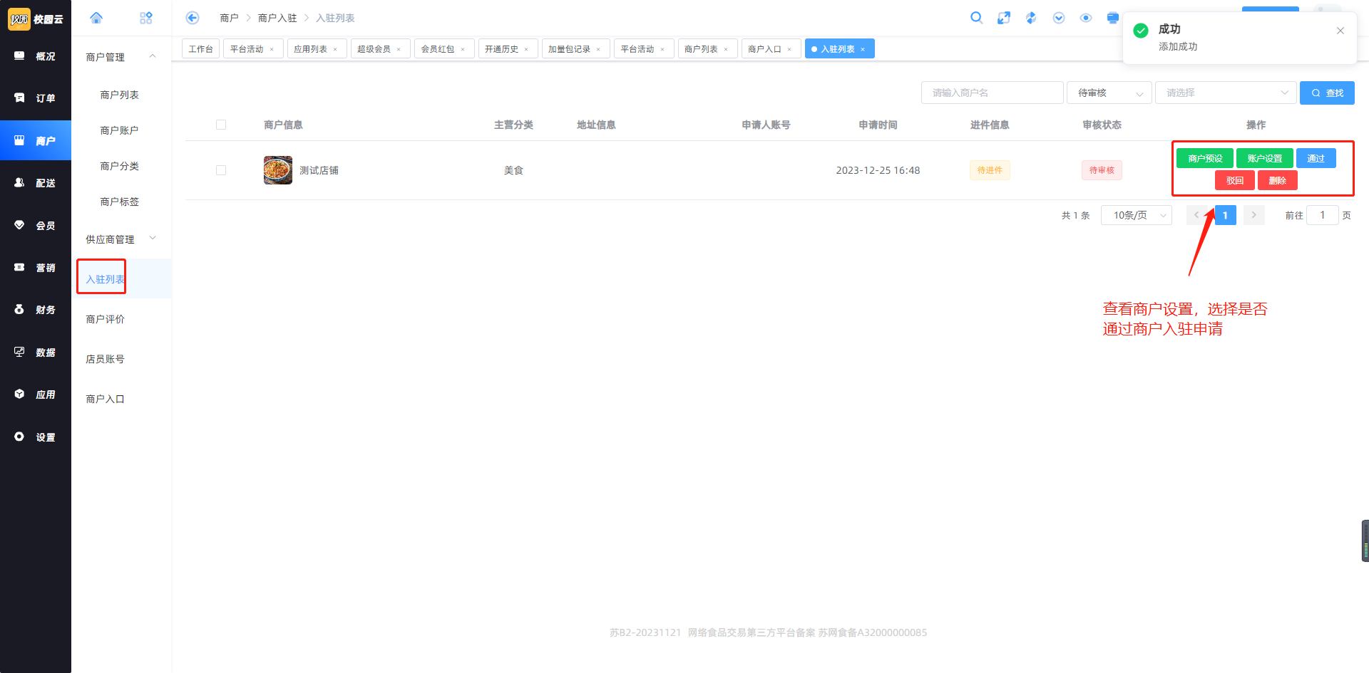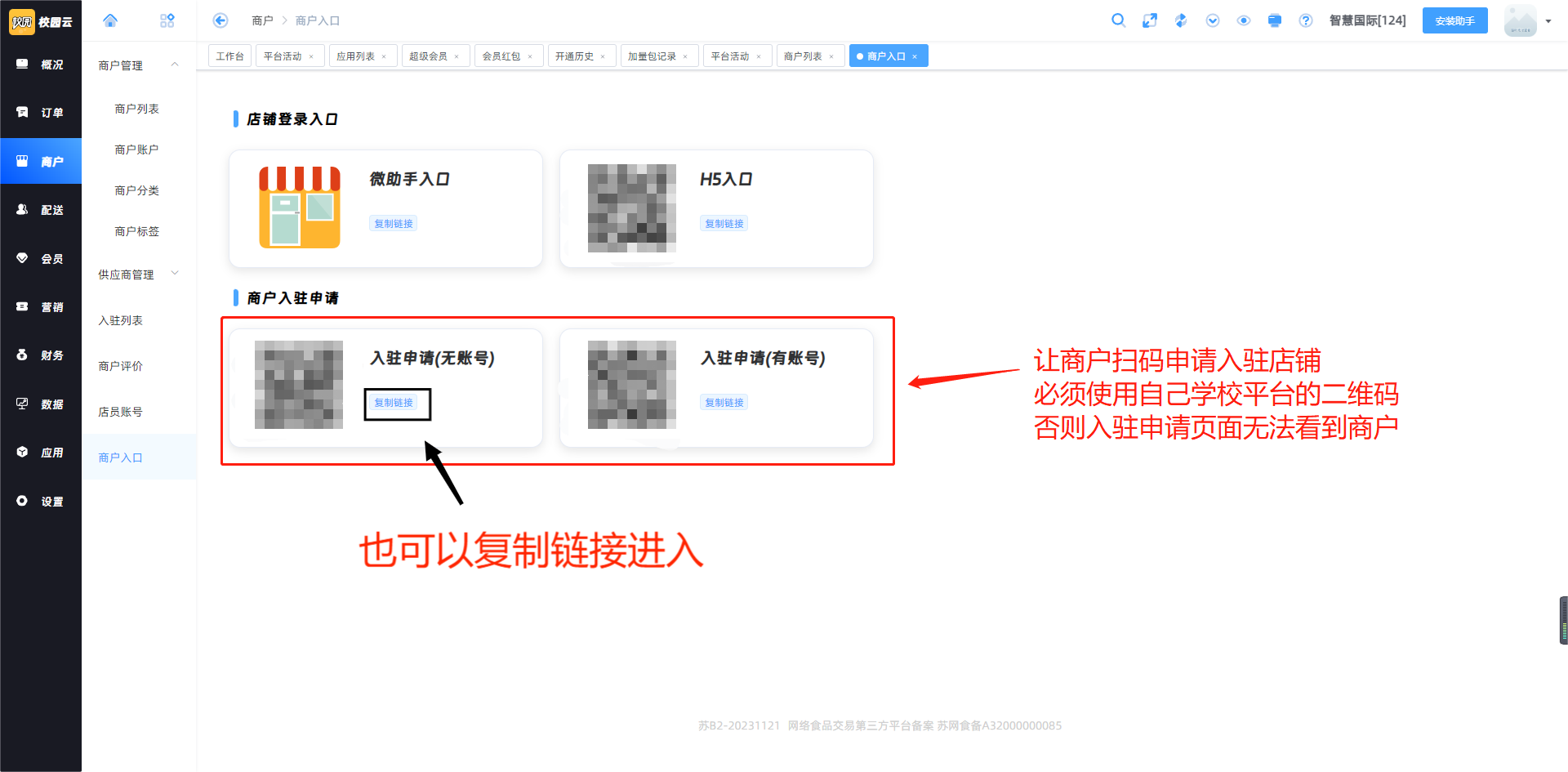 - 复制自己学校商户入驻的链接发给商家入驻。