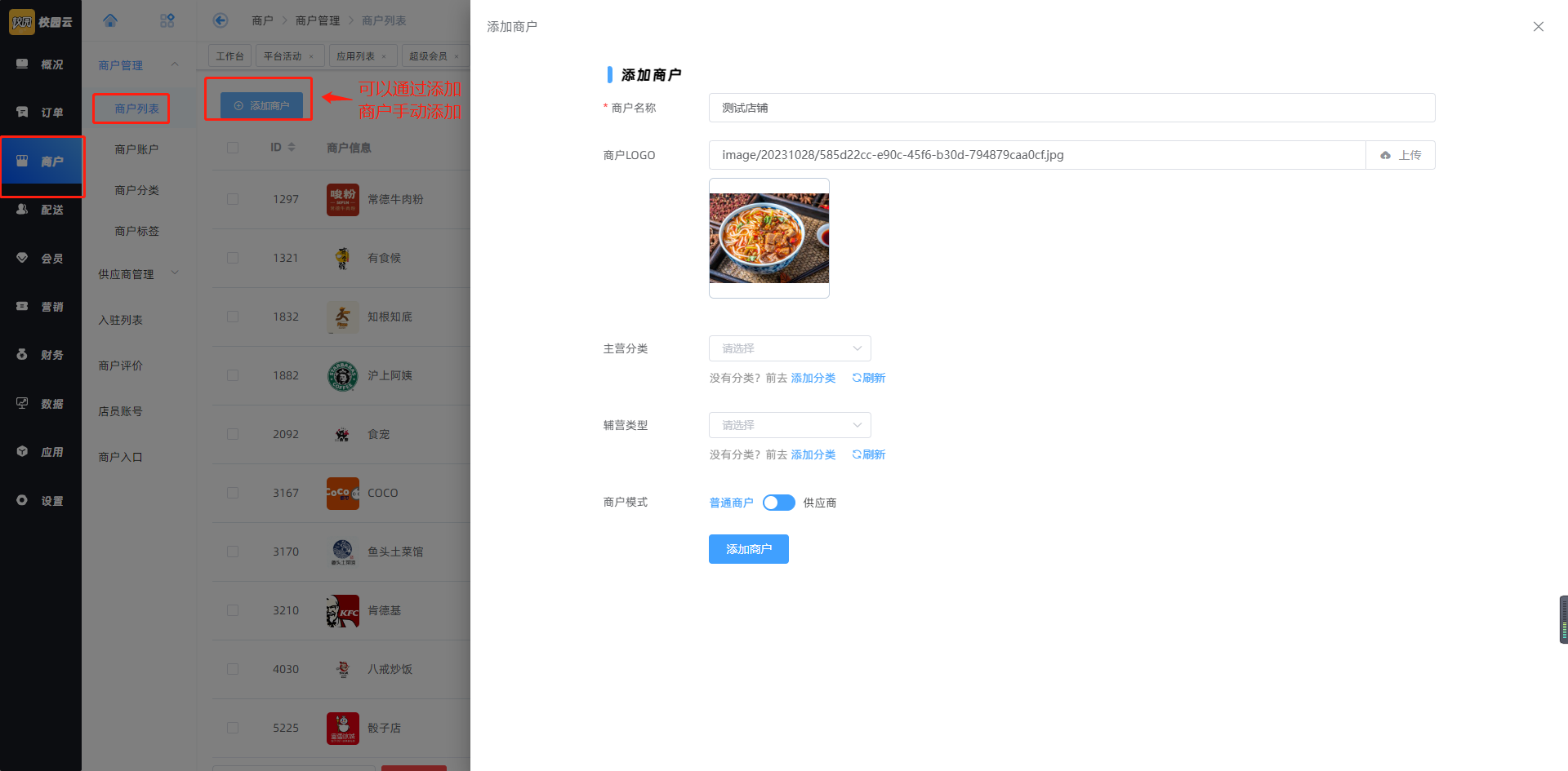 - 我们可以先把学校附近的店铺都采集到平台里面,谈商家的时候直接给配置商家的信息即可。(7天配置一所学校教程里面有讲解)点击查看 (opens new window)