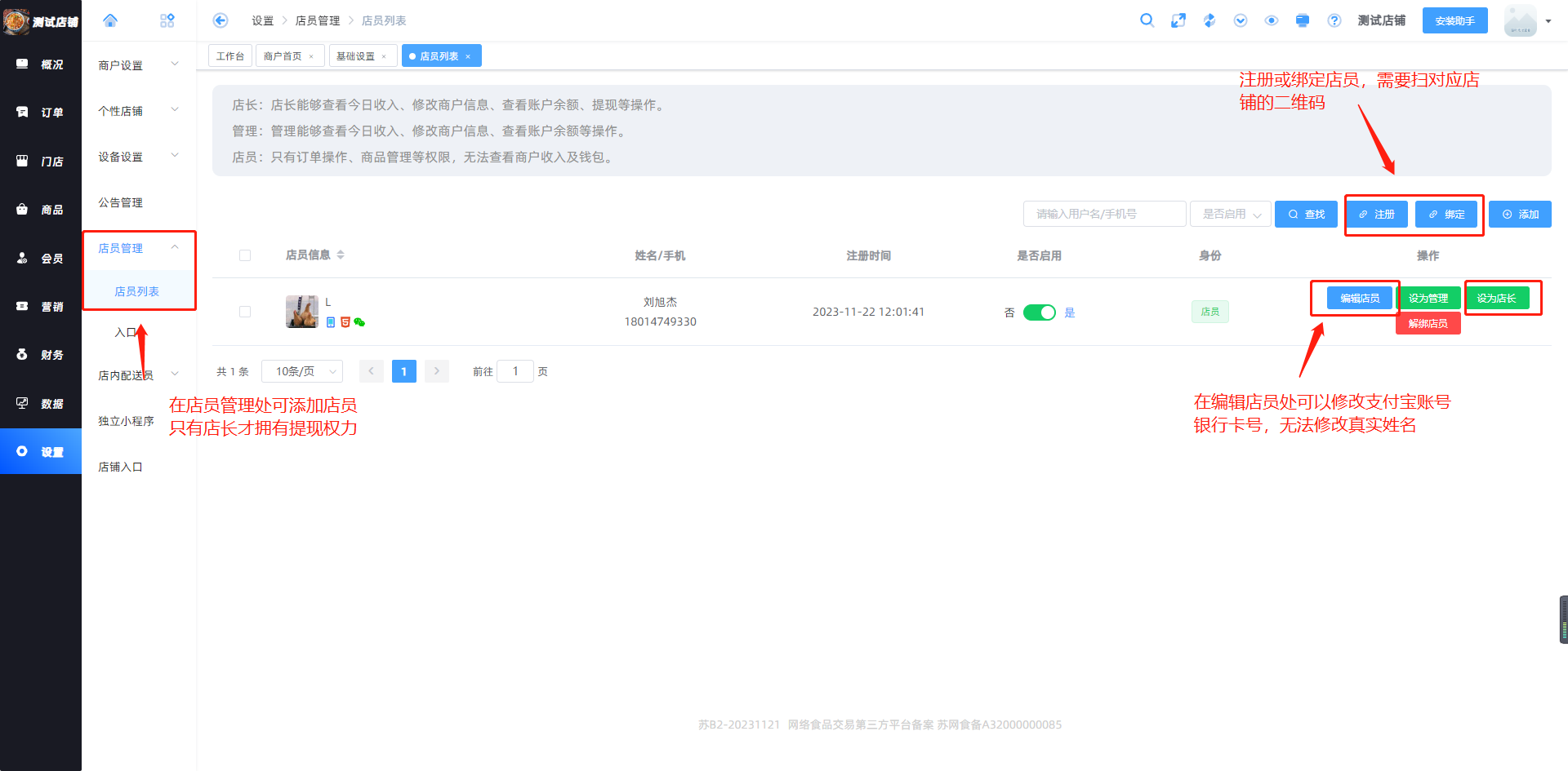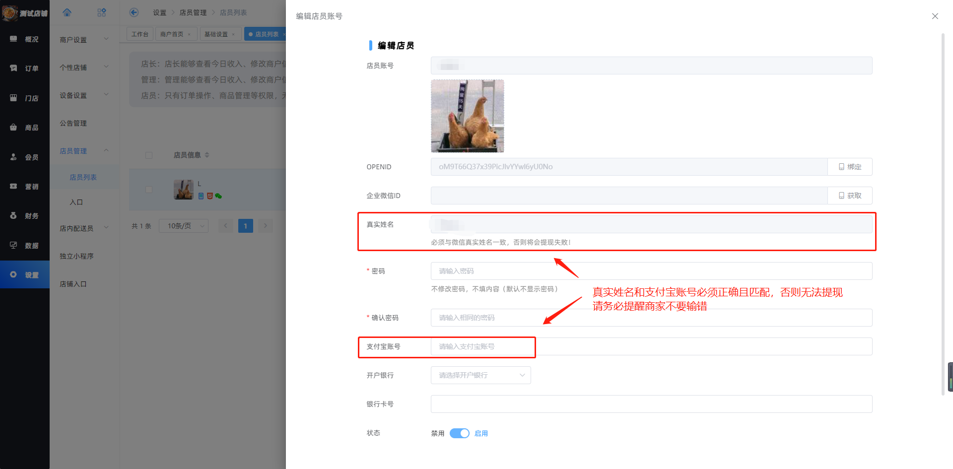 - 只有店长可以提现,提现需要保证真实姓名和支付宝账号正确